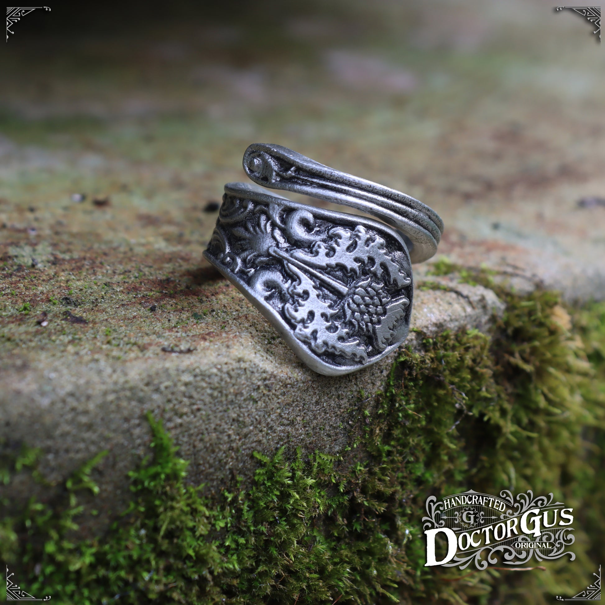 This is an adjustable wrap style ring featuring a Thistle design.