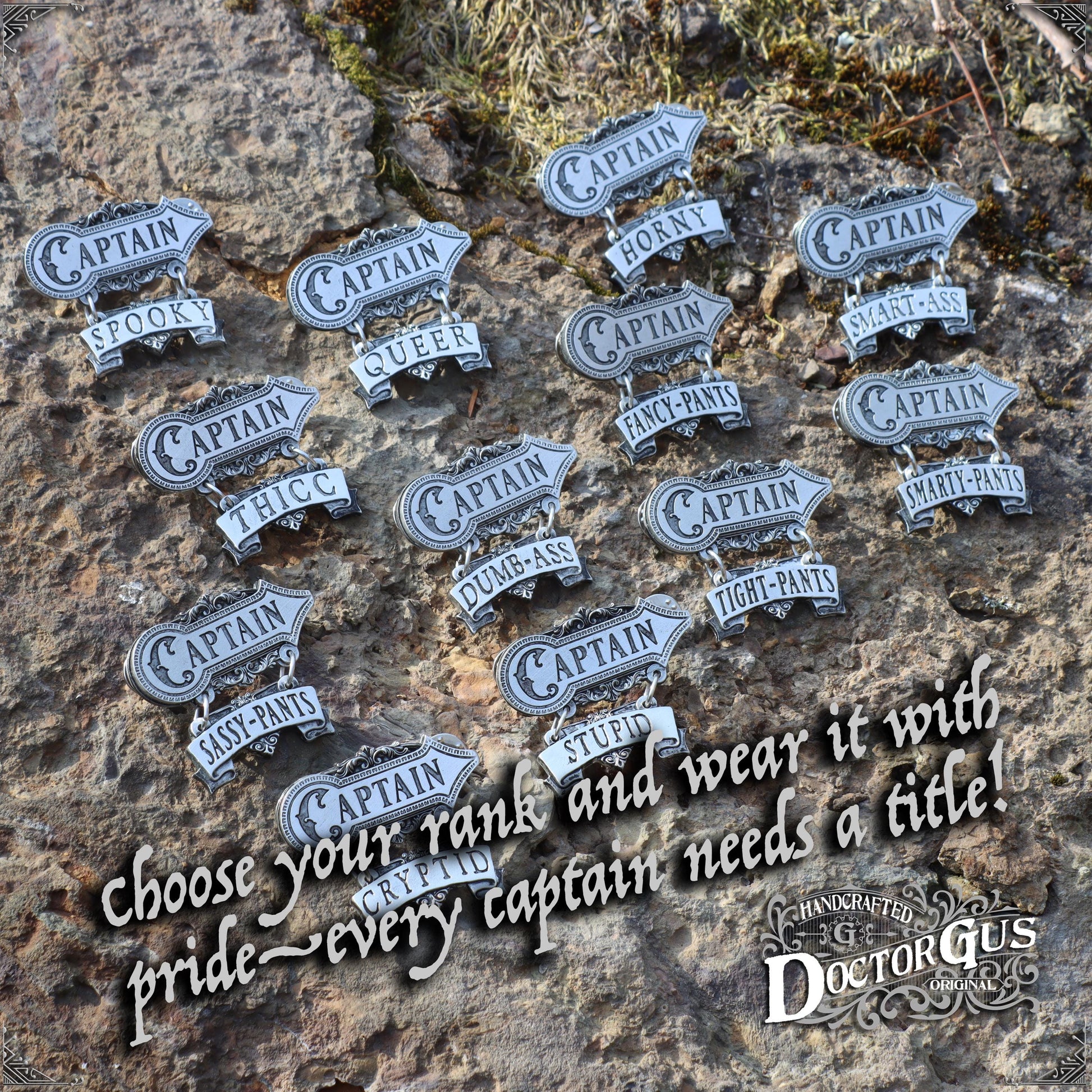Declare your rank with this handcrafted pewter badge, perfect for adding personality to your outfit, costume, or gaming gear. Whether you're Captain Smart-Ass, Captain Stupid, or Captain of Thicc, this pin makes a bold (and hilarious) statement.